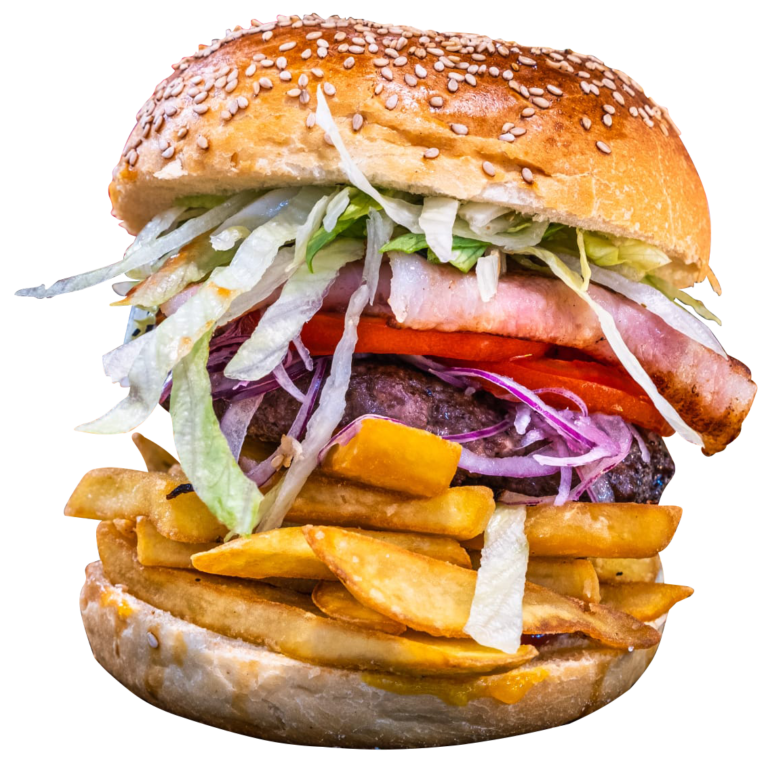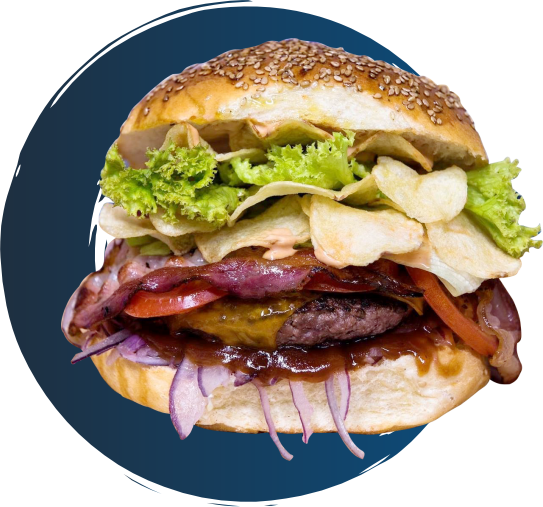 Hamburger, Cheddar, Cipolla, Bacon Croccante, Foglie di Quercia, Patatine in busta, Pomodoro, Origano, Salsa Rosa, Salsa Barbecue