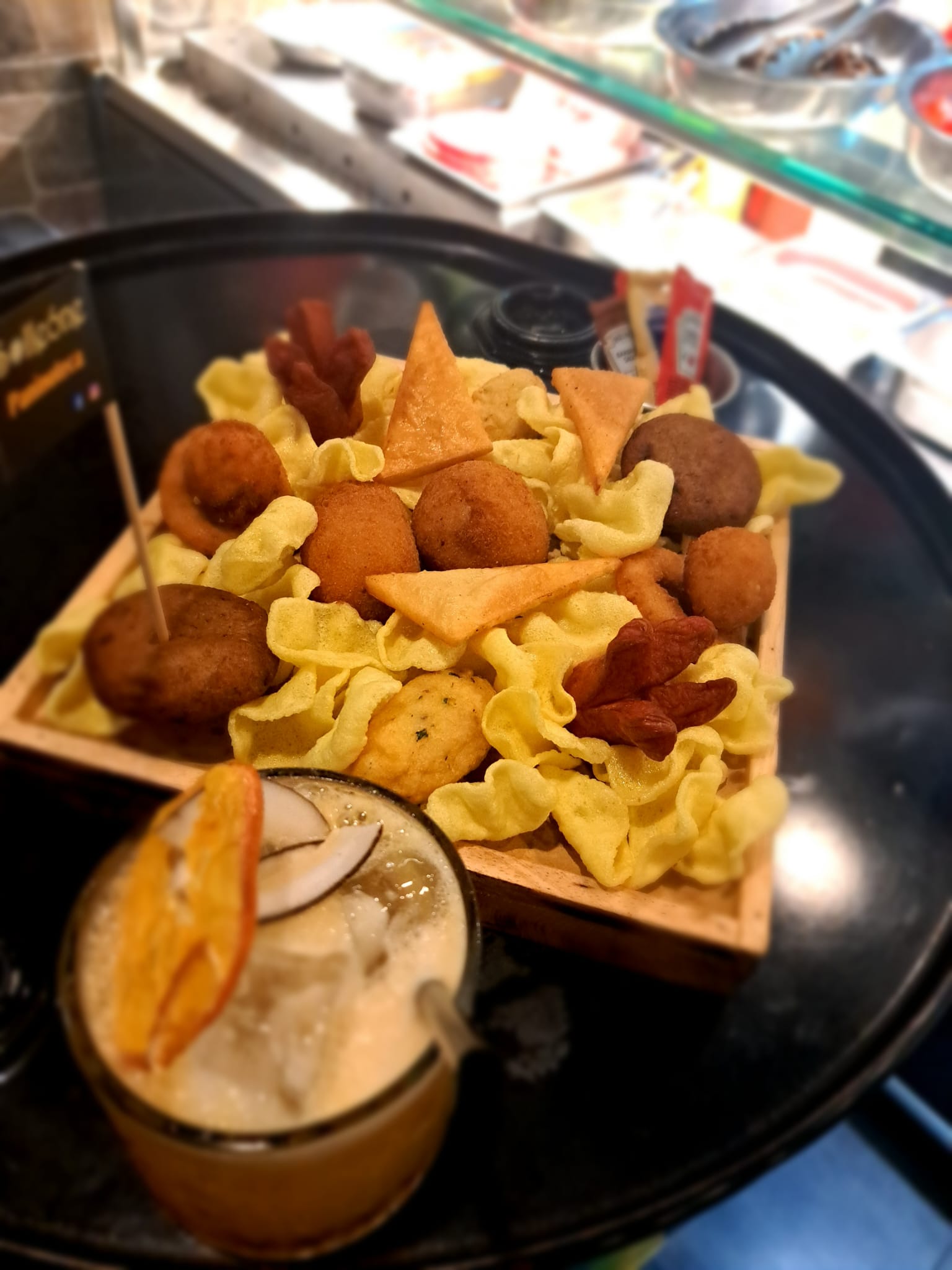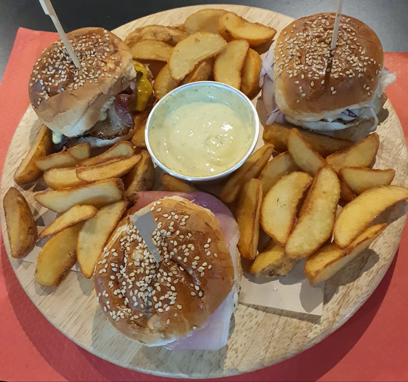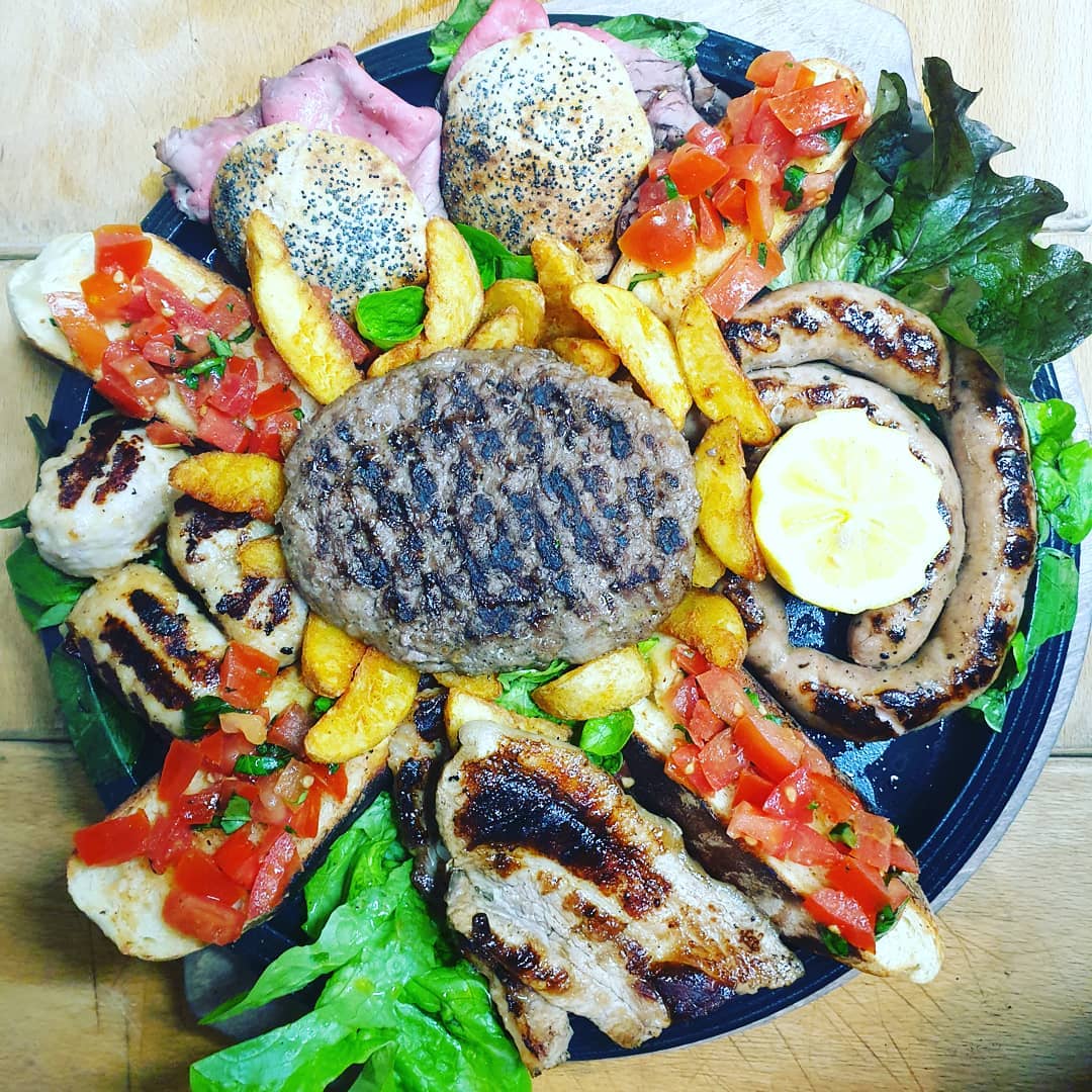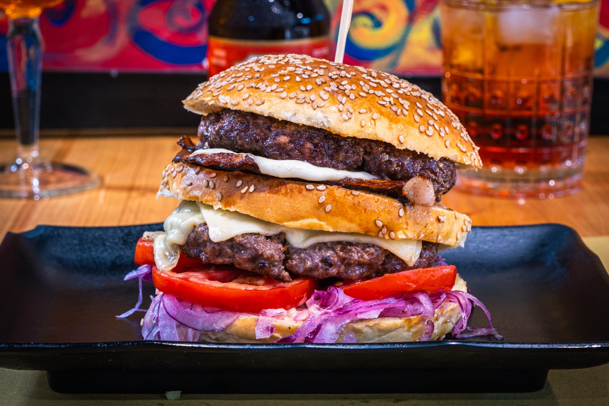 Hamburger, Cheddar, Cipolla, Bacon Croccante, Foglie di Quercia, Patatine in busta, Pomodoro, Origano, Salsa Rosa, Salsa Barbecue